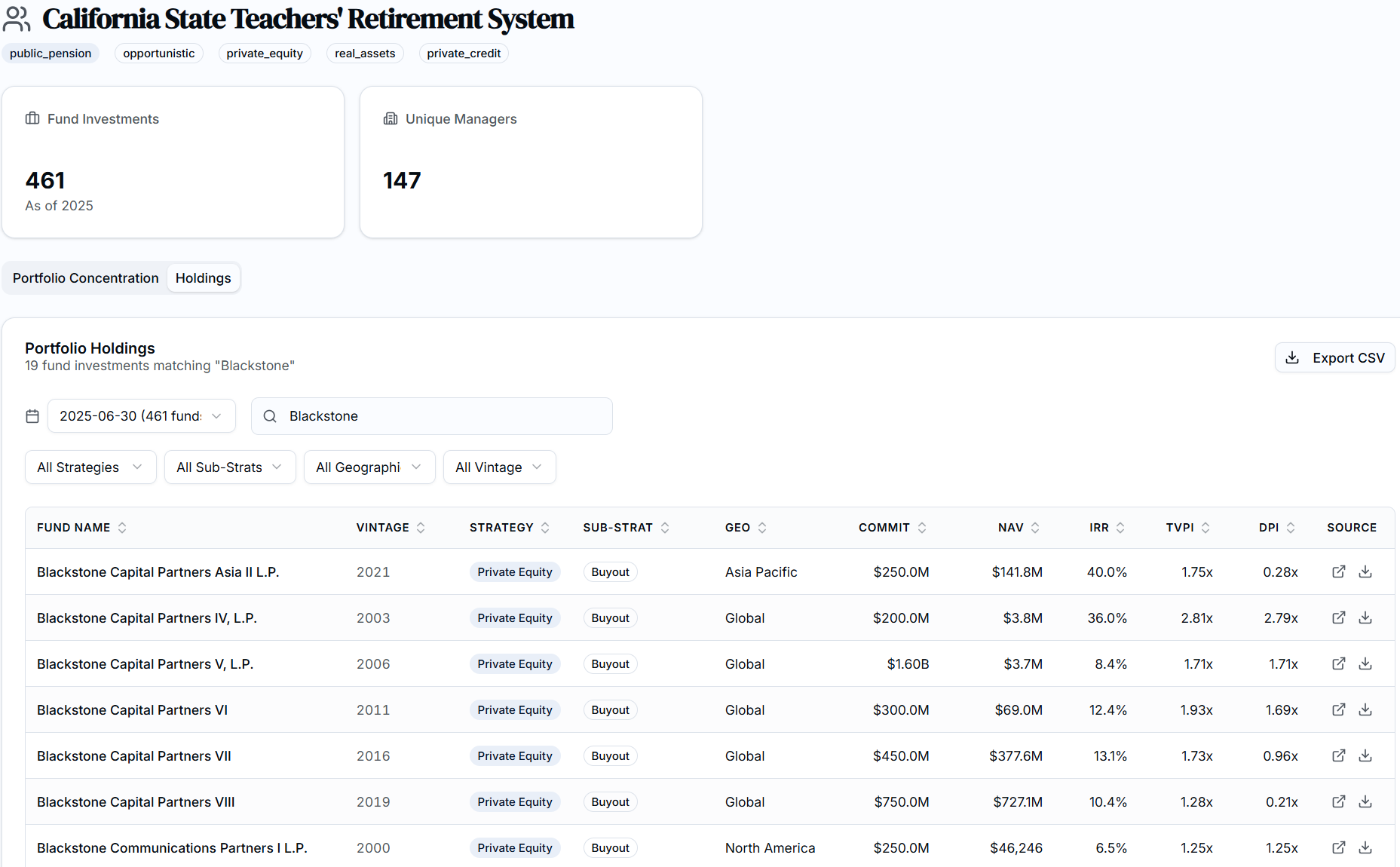 See which funds major pension systems are investing in. Track commitments, performance, and allocation patterns across institutional portfolios.